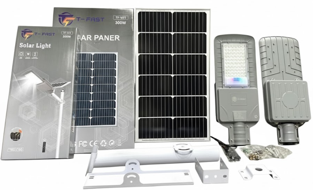 Công suất: 300W Kích thước đèn: 500*200*75mm Kích thước tấm pin: 600*350mm Tấm Pin NLMT: 6V/35W MONO Pin lưu trữ:: 3.2V 36AH Lithium iron phosphate Chip led: 60 Chip led 5054 – 150lm/1W Thời gian sạc: 4-6 tiếng Thời gian sáng: 12-14 tiếng Độ cao lắp đặt: 6-7m Chất liệu: Hợp kim Nhôm Chống nước: IP68 Bộ sản phẩm bao gồm: Đèn + điều khiển từ xa + tấm pin năng lượng mặt trời + cần gắn đèn Số lượng/ thùng: 10 đèn/ thùng, 10 pin/ thùng Bảo hành: 2 năm