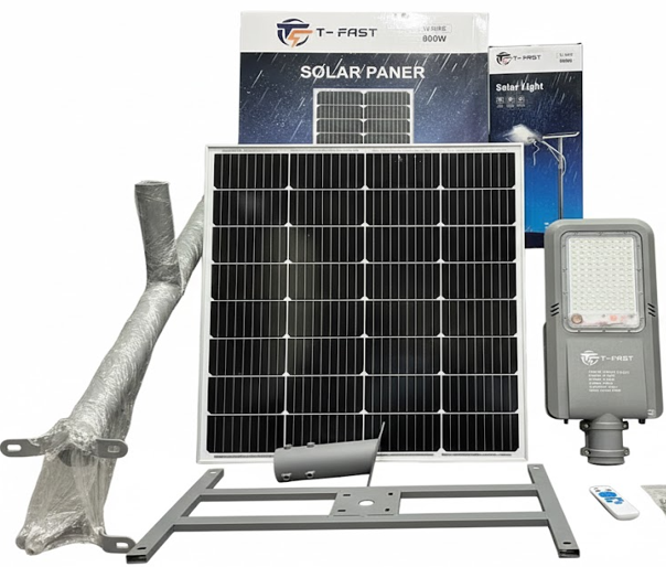 Bộ sản phẩm bao gồm: Đèn + điều khiển từ xa + tấm pin năng lượng mặt trời + giá đỡ tấm pin + Cần đèn